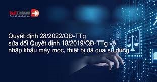 Quyết định Số 18/2019/QĐ-TTg ngày 19 tháng 04 năm 2019 và Quyết định số 28/2022/QĐ-TTg ngày 20 tháng 12 năm 2022 của Thủ tướng chính phủ về việc Quy định việc nhập khẩu máy móc, thiết bị, dây chuyền công nghệ đã qua sử dụng.